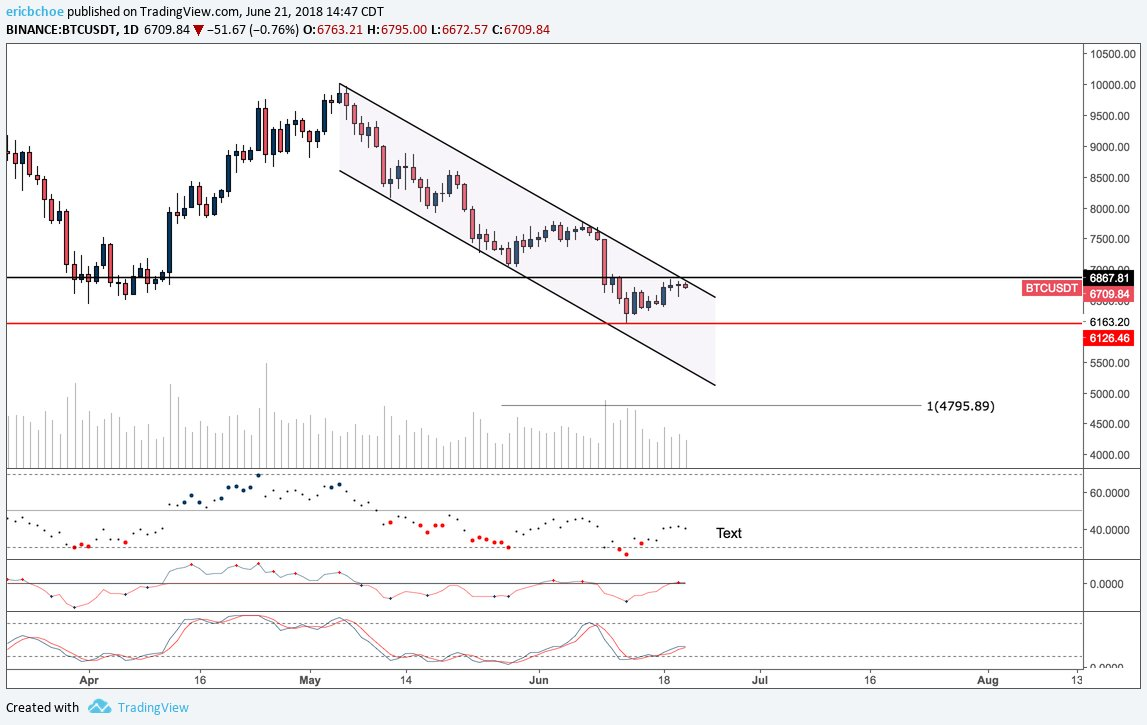 BTC seems to be forming another bear flag. The previous bear flag produced a significant fall from those levels, so if BTC is forming a Bear Flag at these levels, we could easily go below $6k. Another puzzle piece that fits this argument (for lower future prices) is the fact that the buying volume is very low. Price is not in sync with the volume, which historically has meant eventual lower prices.
