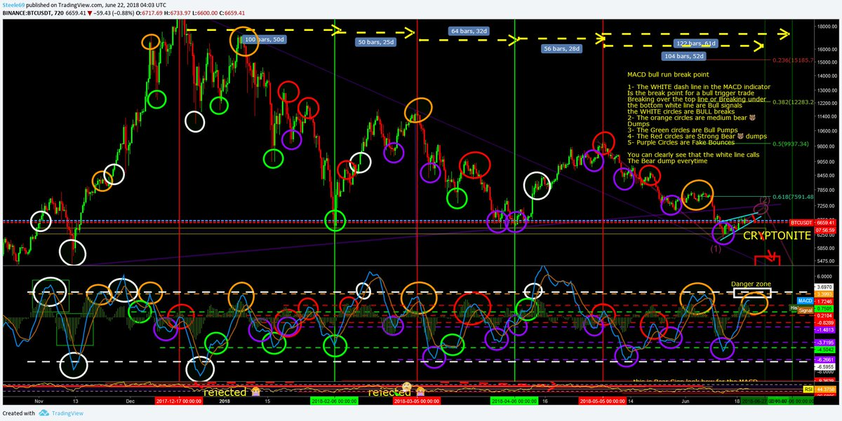 [Macro argument is that BTC is consolodating at these levels and building steam for higher highs in the FUTURE is still his macro perspective. In his opinion we're not seeing BTC reaching all time high any time soon. BTC next big resistance is the top of $9990. Since Feb. BTC's seen 3 major bottoms around the 6k-7k level. Which is an indication of forming higher lows and confirms a macro bullish trend (Green Line on Chart). Patience will be the key word for medium/long term investors in the BTC Market]