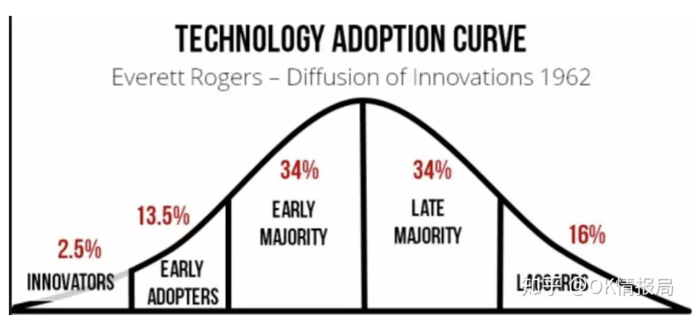 A 30% discount to the figure of 24.7 trillion, US$7.4 trillion, will be closer to reality, which is almost the total market value of gold at present. Let's calculate again, 7.4 trillion / 287.1 billion = 25.8 times, 0.7%*25.8 = 18.06%, which is between the early adopters and the early majority. Considering that the current valuation already contains a lot of future growth expectations Most of the early stages are reasonable predictions. This looks more reliable.