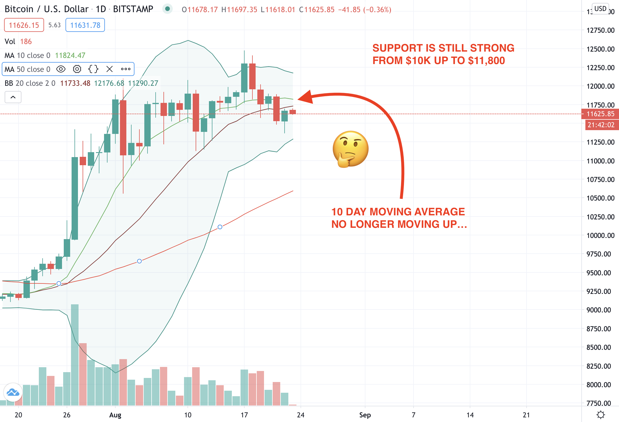 The charts are showing us some short term signals that indicate a pullback might be coming. We don't expect it to go below $10K... but of course anything could happen.