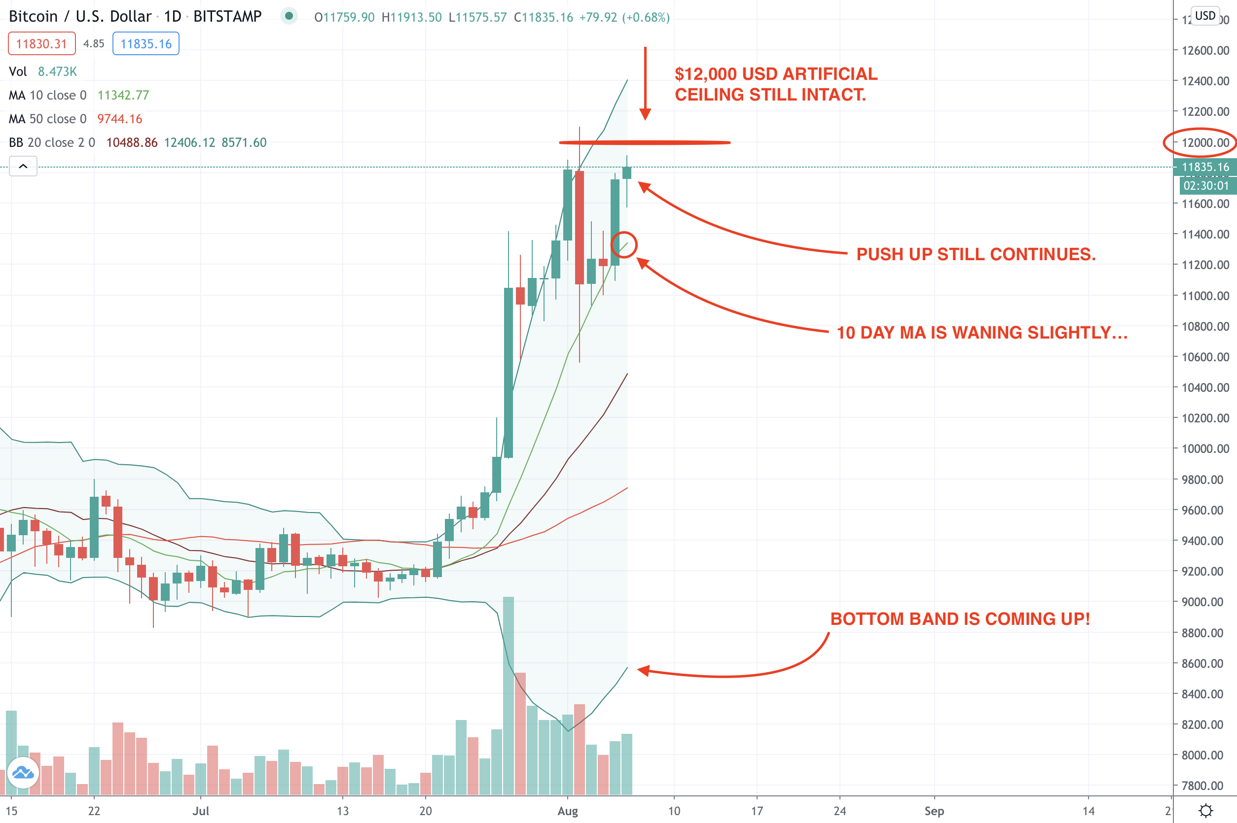 Despite yesterdays big move (up about $500.00 USD) Bitcoin looks happy to just camp out here for now. It's teetered up to $11,900 today and currently is back down at $11,715. The $12K temporary ceiling is set and Bitcoin may just rest a few days before testing it.