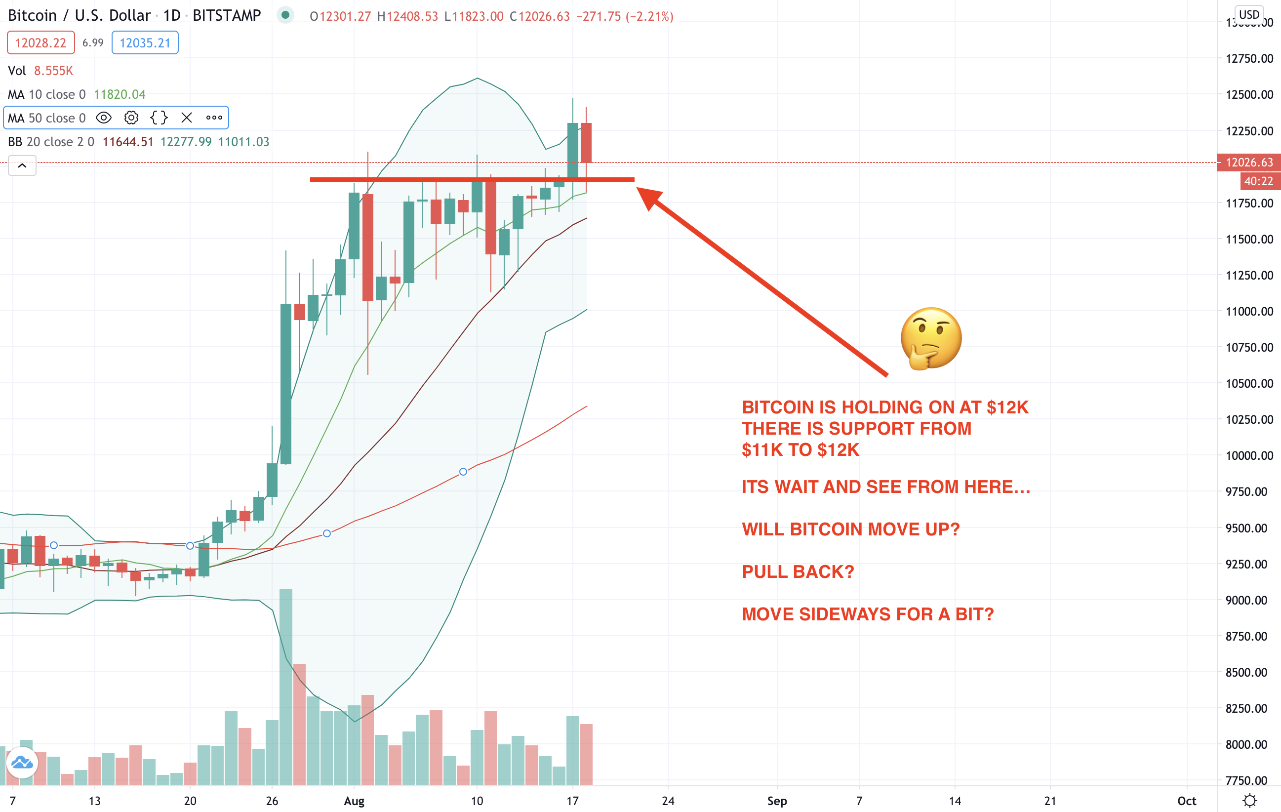 We suspect after the pullback and support is tested BTC will make another push upward... likely testing it's last highest point in 2019 (after crypto winter). We expect this level to test will be $13,500 to $14,000 but for now it's wait and see!