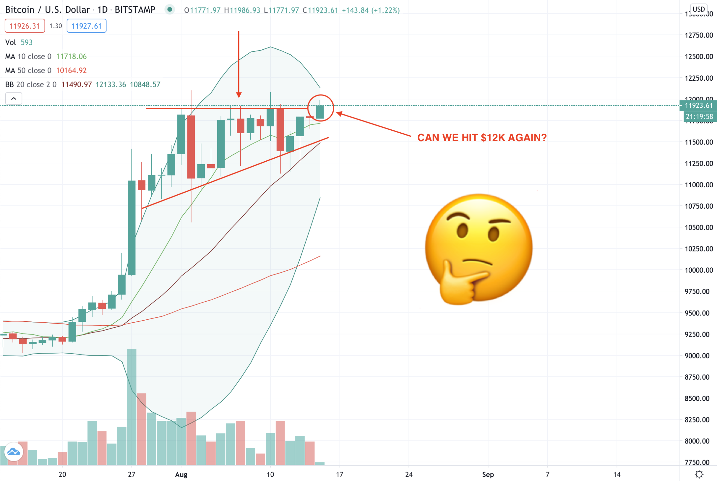 When will Bitcoin move though? And will it be up or down?! We predict a move up is coming but it's very hard to predict in the short term. At the moment Bitcoin's ability to hang in there at around $12K is a good sign. Especially considering that the $10K mark was a HUGE mental hurdle to overcome.
