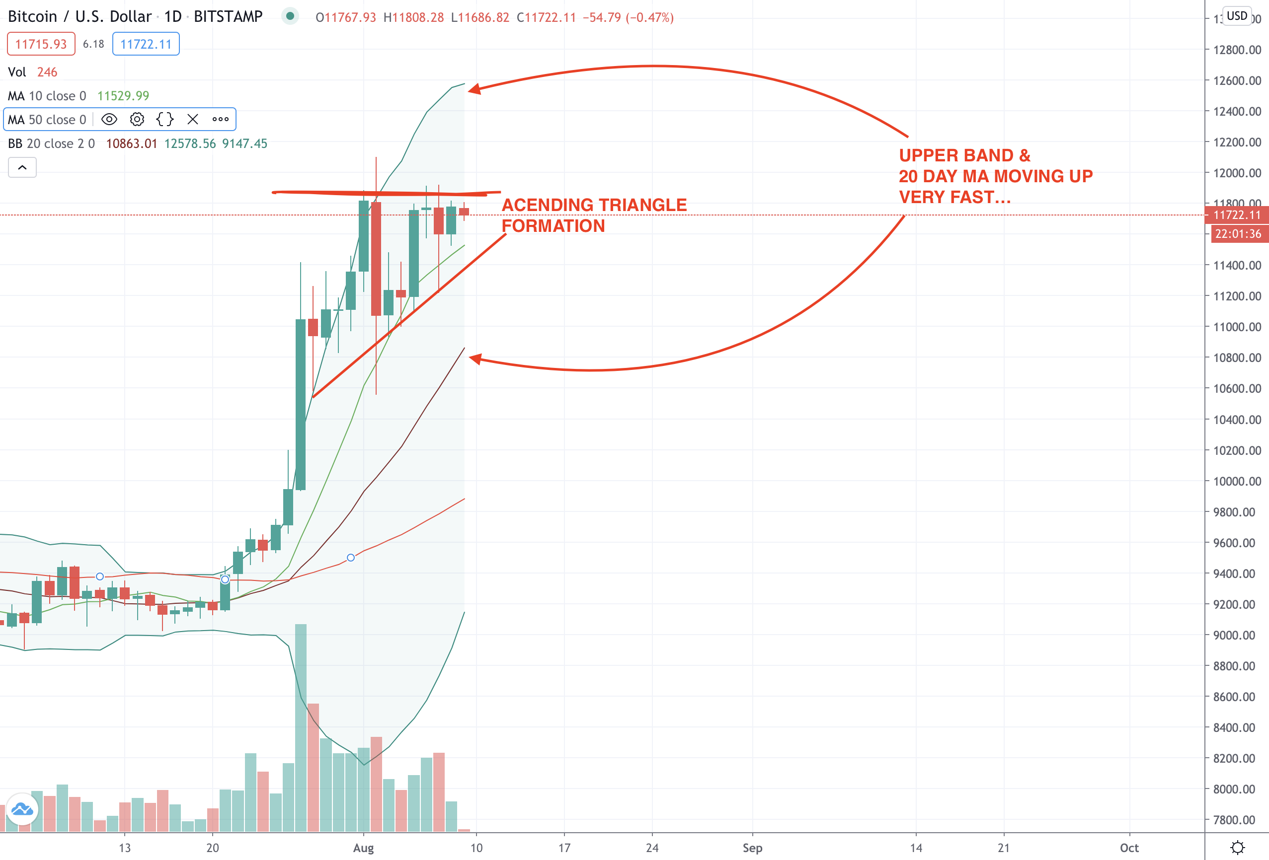The ascending triangle continues to take shape. Bitcoin is moving sideways for now but a sudden move is expected as it continues to get squeezed in this triangle.