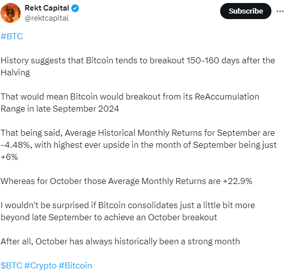 September had historically been a difficult month for Bitcoin, often resulting in losses. However, some analysts, such as Rekt Capital, suggested that Bitcoin might still be in the midst of a post-halving breakout, possibly occurring by late September. Looking ahead, October was historically a stronger month for Bitcoin, with the potential to trigger a significant rally.
