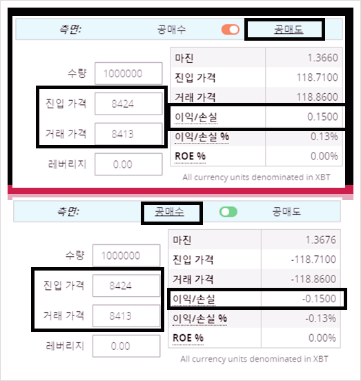 위에 사진처럼 8424달러에 공매도를 진입하여 8413 11달러 하락하였습니다수익은 0.15비트 입니다하지만 공매수로 진입을 하고 11달러가 하락하면 0.15비트를 잃습니다그만큼 포지션진입은 중요합니다
