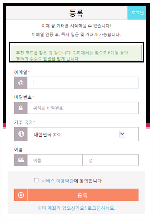 먼저 회원가입방법 및 수익내는방법을 소개하려고합니다밑에 배너를 클릭하시고 이동하시면 수수료 할인혜택을 받을수 있습니다수수료가 크기때문에 꼭 할인혜택 받으시기 바랍니다.
