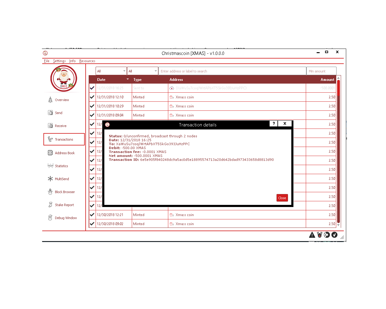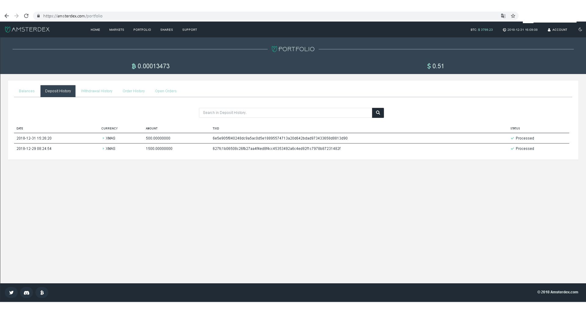 Now I'm updating with more good news about Amsterdex. The exchange officially launched and now everyone is able to trade. I made deposit before 2 or 3 days and i sold some of my Xmas coins, to test deposit. Everything was smooth. Now I will deposit 500 Xmas coin to show you that Amsterdex is fully ready to trading. Now I will deposit and withdraw Xmas coin. Deposit has been confirmed for ~10 mins. Then I withdraw 499.95 Xmas coin and I received a coins instantly.