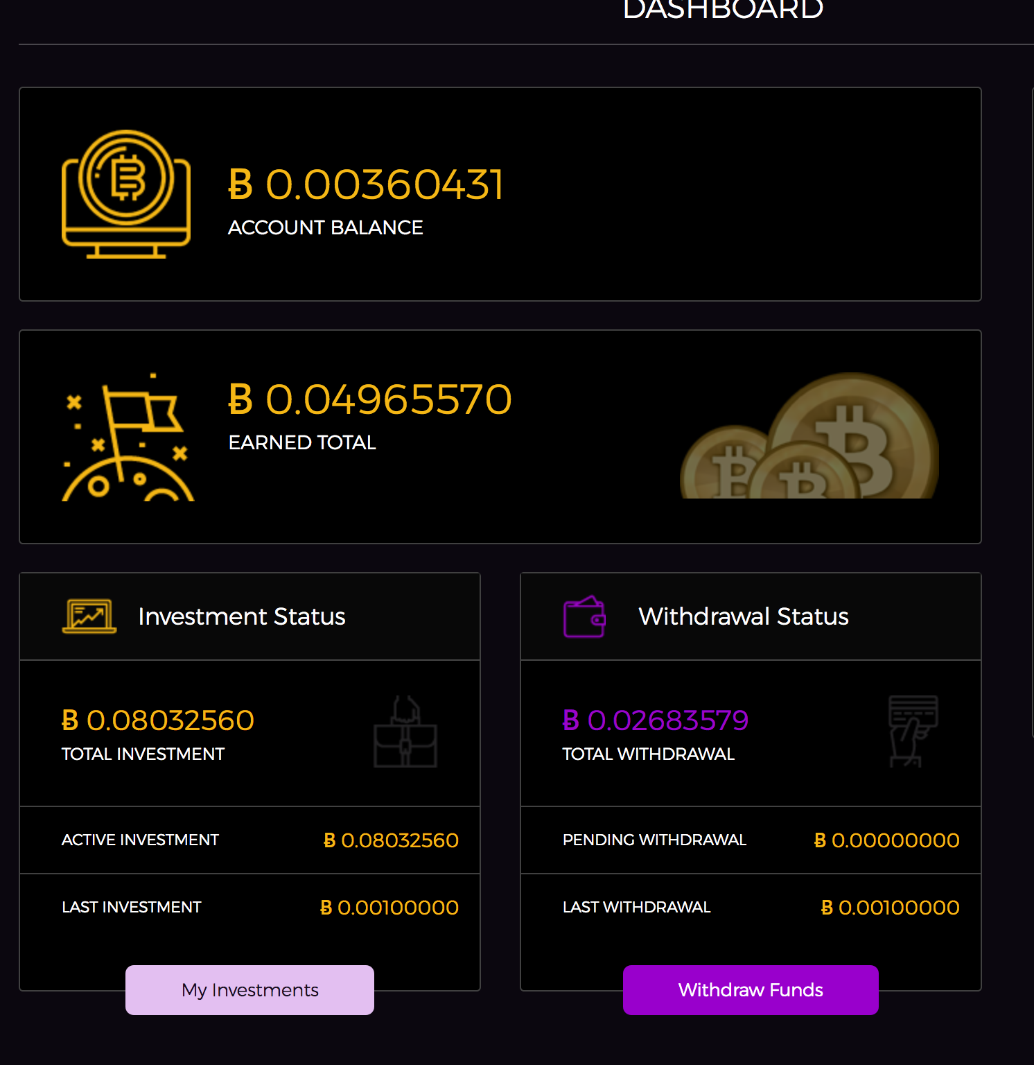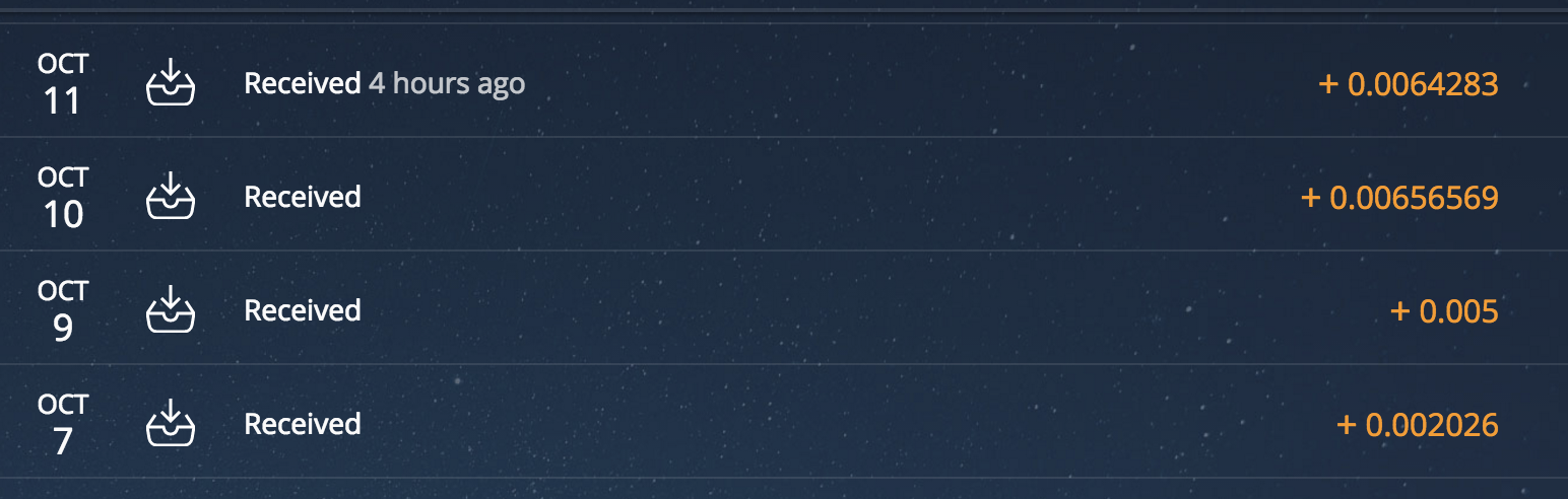 Ich hatte mit einem kleinen Investment von 40 USD begonnen und bin mittlererweile bereits bei fast 0.1 Bitcoin (400 USD) investierten Bitcoins. Somit bekomme ich im Moment 30 USD täglich auf mein Konto und entscheide dann direkt es wieder zu investieren oder doch einfach auszuzahlen.