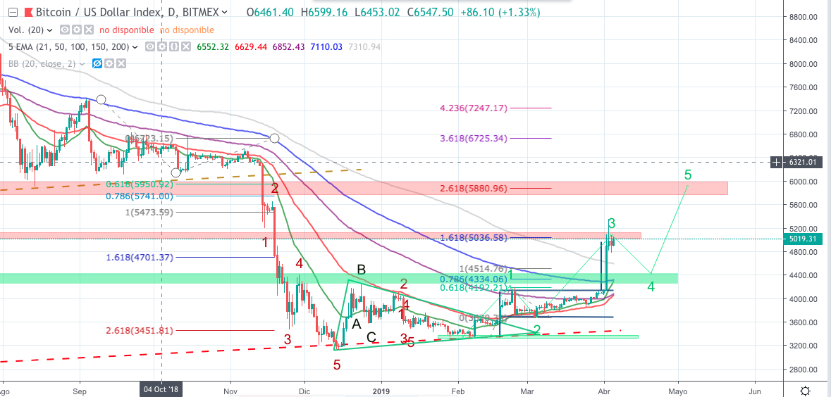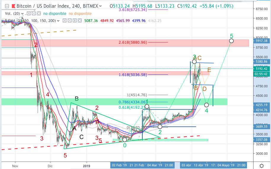 Esta correccion alcista que deberiamos ver en el precio formaria una onda 4 de elliot que podria coincidir (de producirse en las proximos dias) con la linea movil EMA de 150 periodos 1D