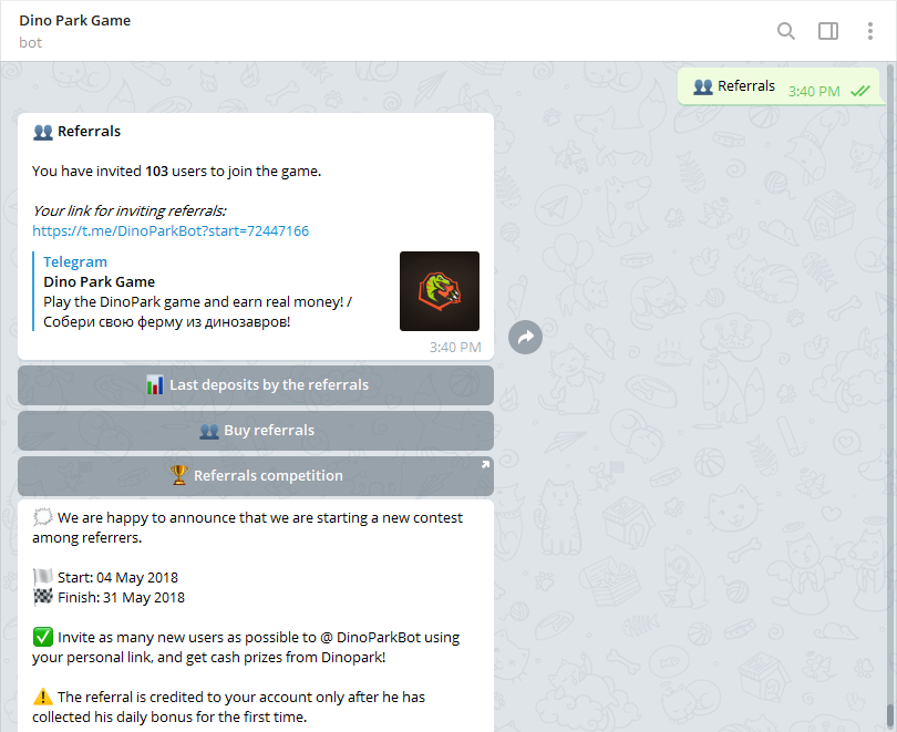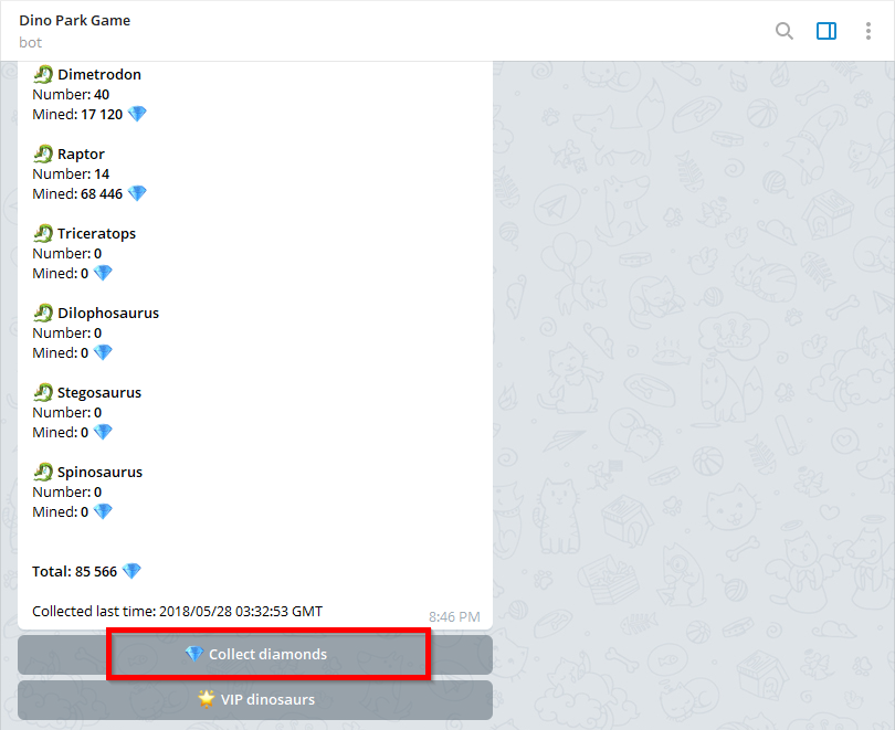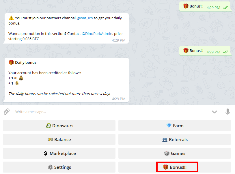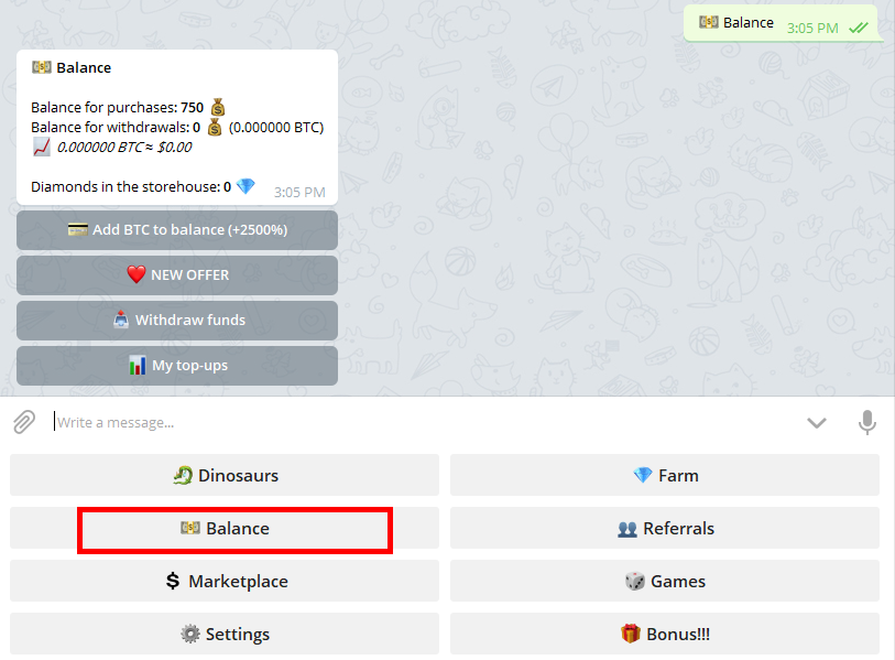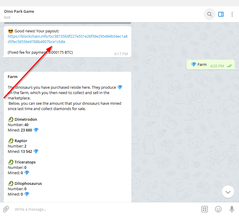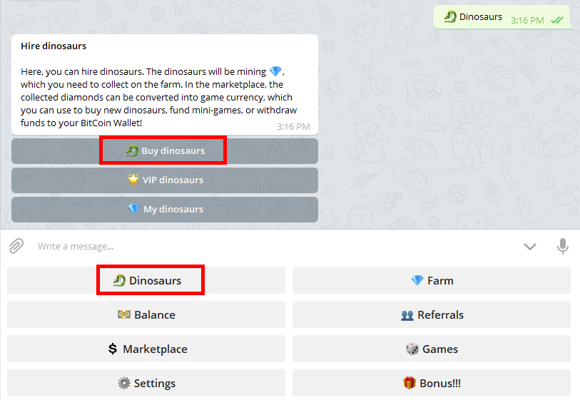 To make it really simple and easy to understand, let's imagine the following. We'll go into the details later, for now let's just focus on the concept of the game. Let's imagine a huge farm where we look after dinosaurs instead of the usual animals. Just like in the movie Jurassic Park. Yes that's right, real dinosaurs. We are the farmer in this game and we look after dinosaurs. These dinosaurs mine diamonds and we can sell these diamonds for money bags. Once we have a certain number of money bags we can withdraw them in bitcoins into our favorite bitcoin wallet. This is the concept of Dino Park Game in short. By the way, at this moment this game is only available on the Telegram messenger. Also, I have already written about Dino Park Game here, only this time I decided to do a full review.