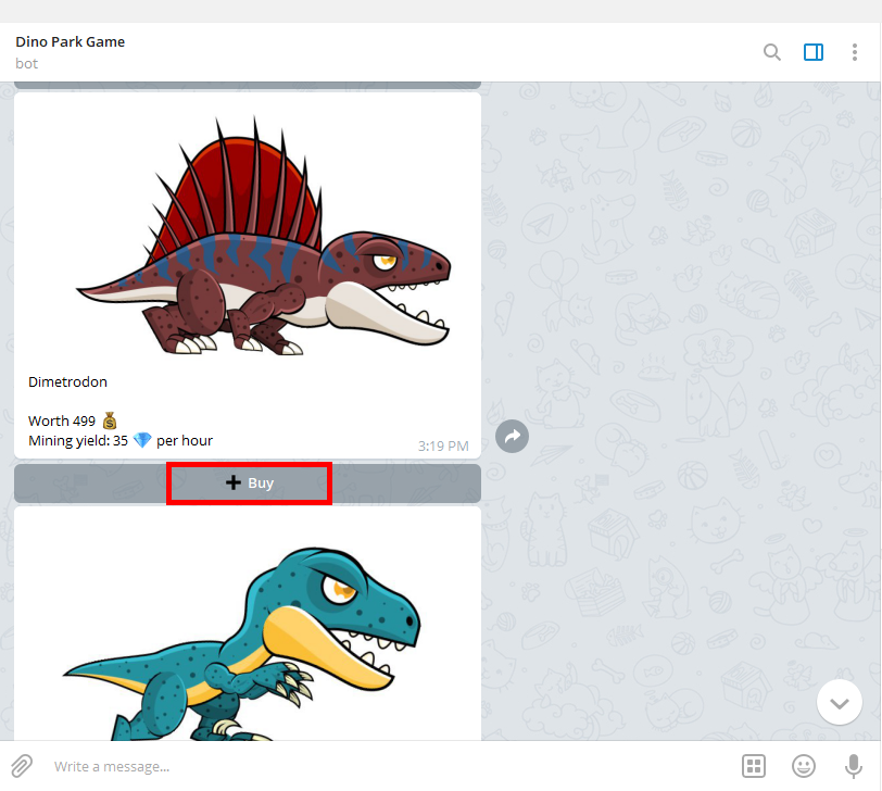 Dimetrodon is the cheapest dinosaur in the game and it can mine 35 diamonds per hour. As soon as you press that buy button your dinosaur will start mining diamonds for you. You can calculate that one Dimetrodon will mine 840 diamonds in 24 hours (35*24).