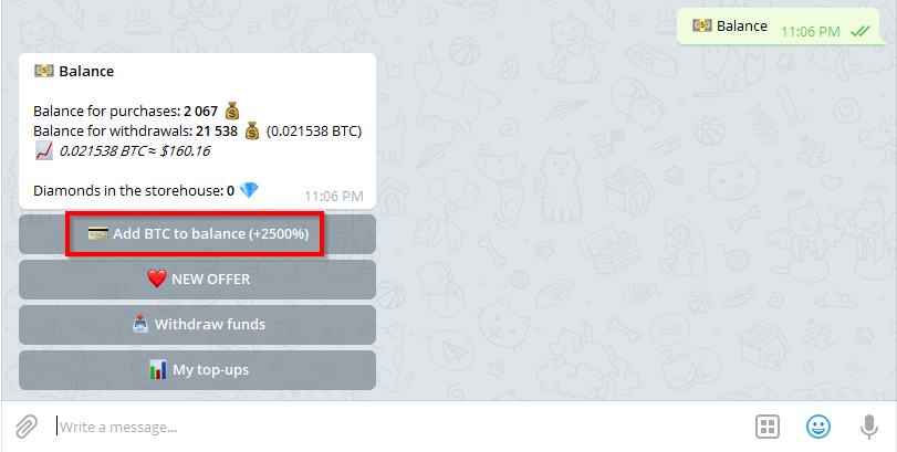 If you want to buy your first Raptor quickly and earn more moneybags in the game, then you need to deposit bitcoins into the game. Do deposit, just go to 'Balance' and press 'Add BTC to Balance (+2500%)' button as shown in the screen below.