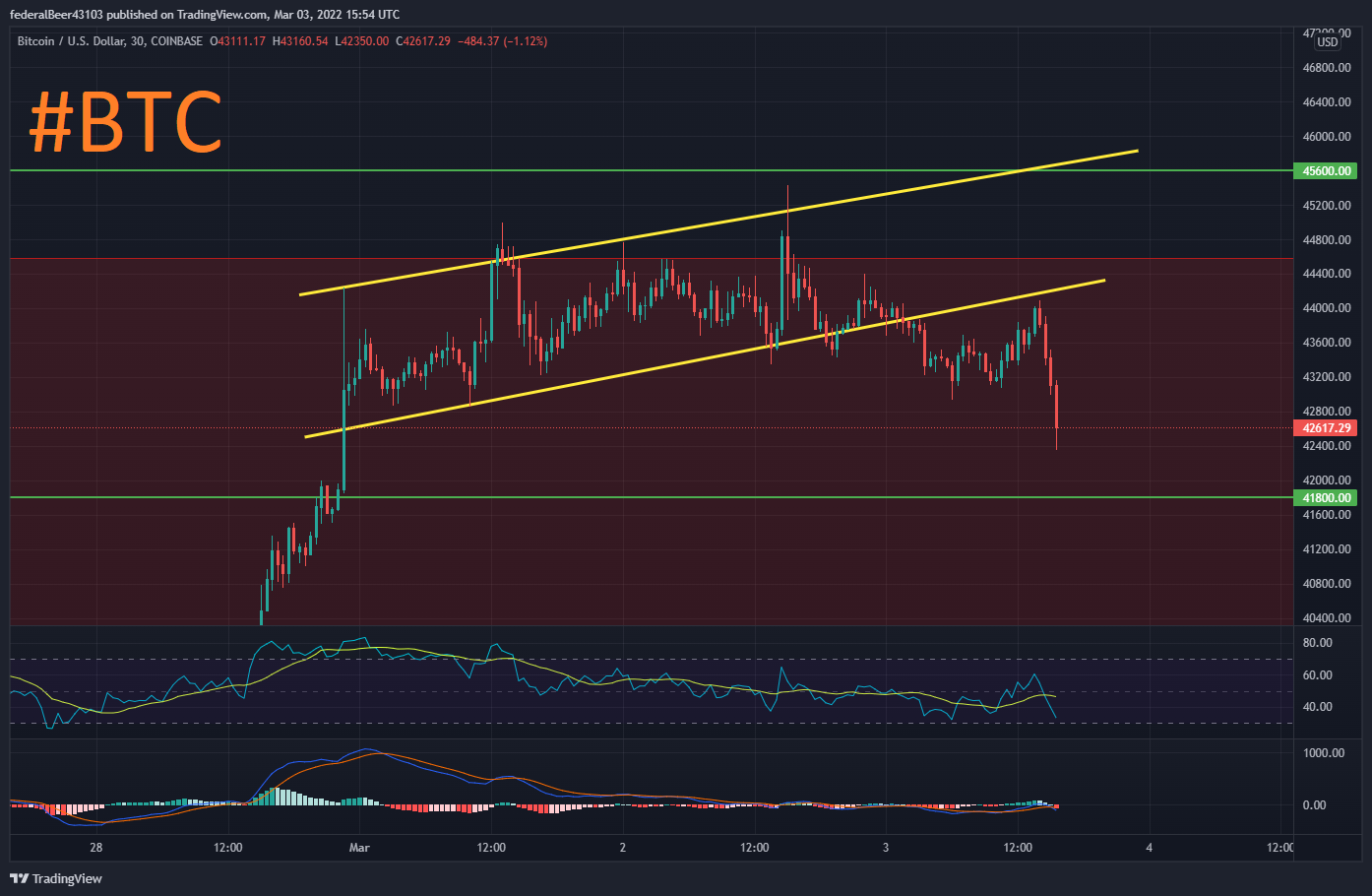 The important support level is currently around 42,300-41,800. If we break through these levels again and confirm resistance here, as we saw awesome at 44,000 and the bullish channel, then there is a possible further decline to 41,300-39,600.