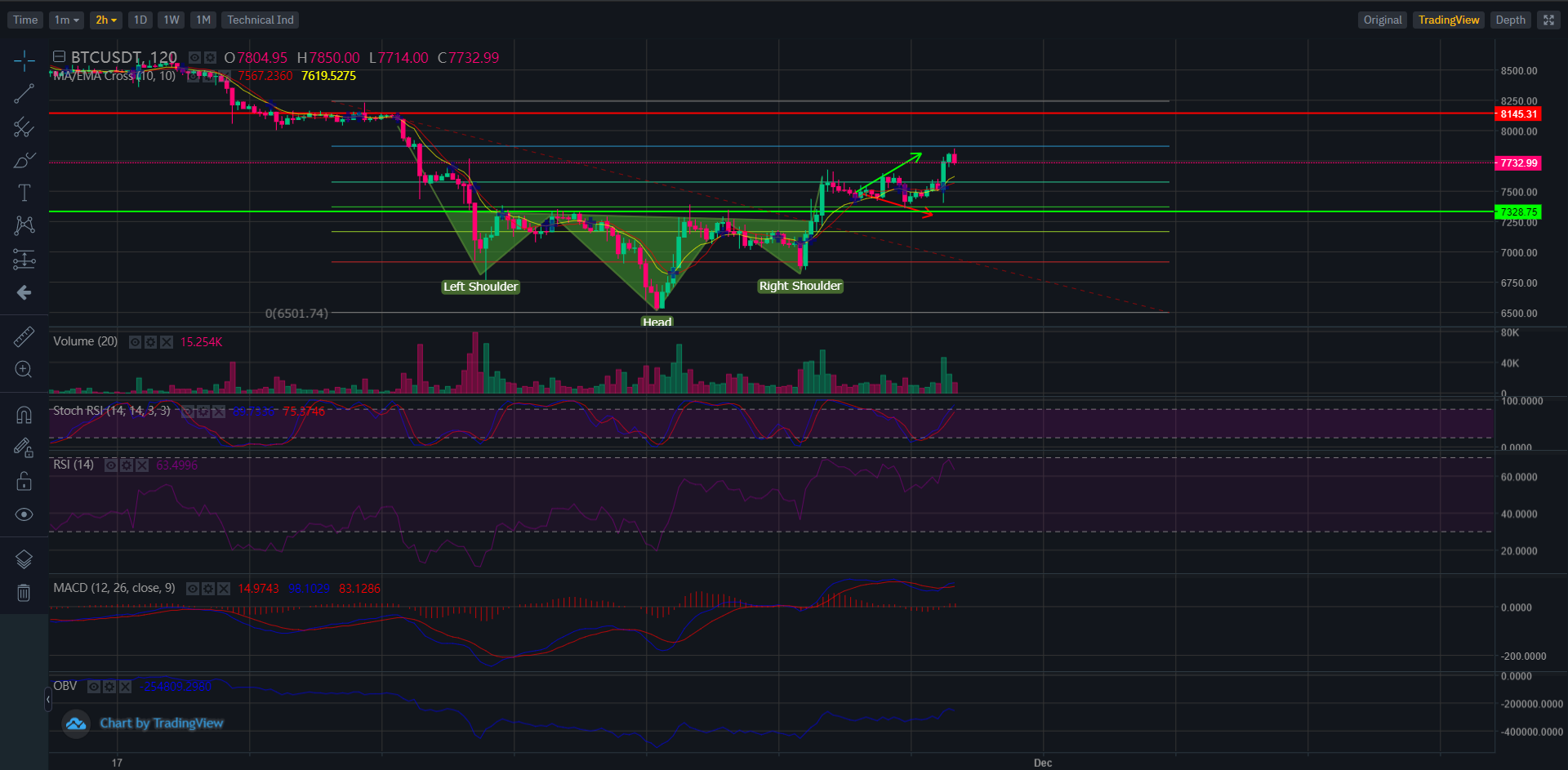 it seems 7800 shows as a new resistance level and these two indicators stoch rsi and rsi showing to us that we are overbought at the 2hr chart I think we need a pullback around 7500 before we break this new resistance level