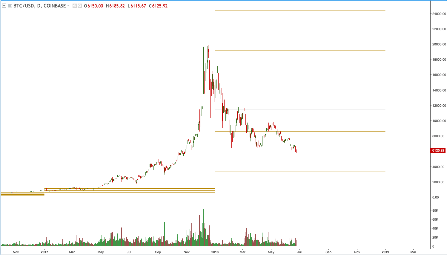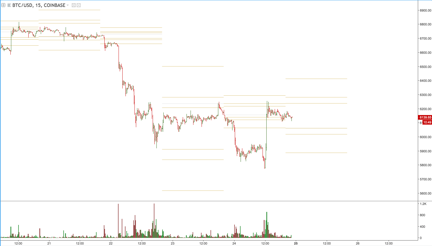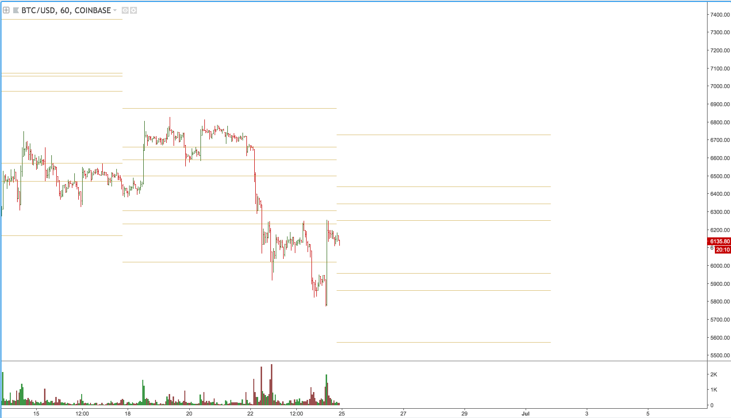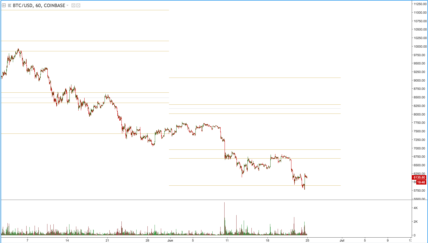 The past 24 hours has definitely had everyone on the edges of their seat. Bitcoin down below $6,000.00 is something we haven't seen since February. From Coinbase we technically broke that yearly low from Feb, which was $5873.00 and we just hit $5777.00 as the low.