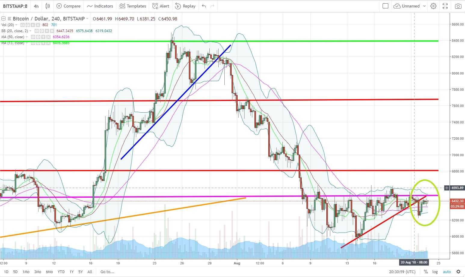 So as predicted we had a break out from the triangle that I traced you yesterday. It was a down Break Out and it dropped of around 200$ in some hours... not so bad for a short term trade. We are now currently trying to go back and touch the red line that we just broke. Let's see if this little up will be able also to test the resistance line at 6500$ in pink.