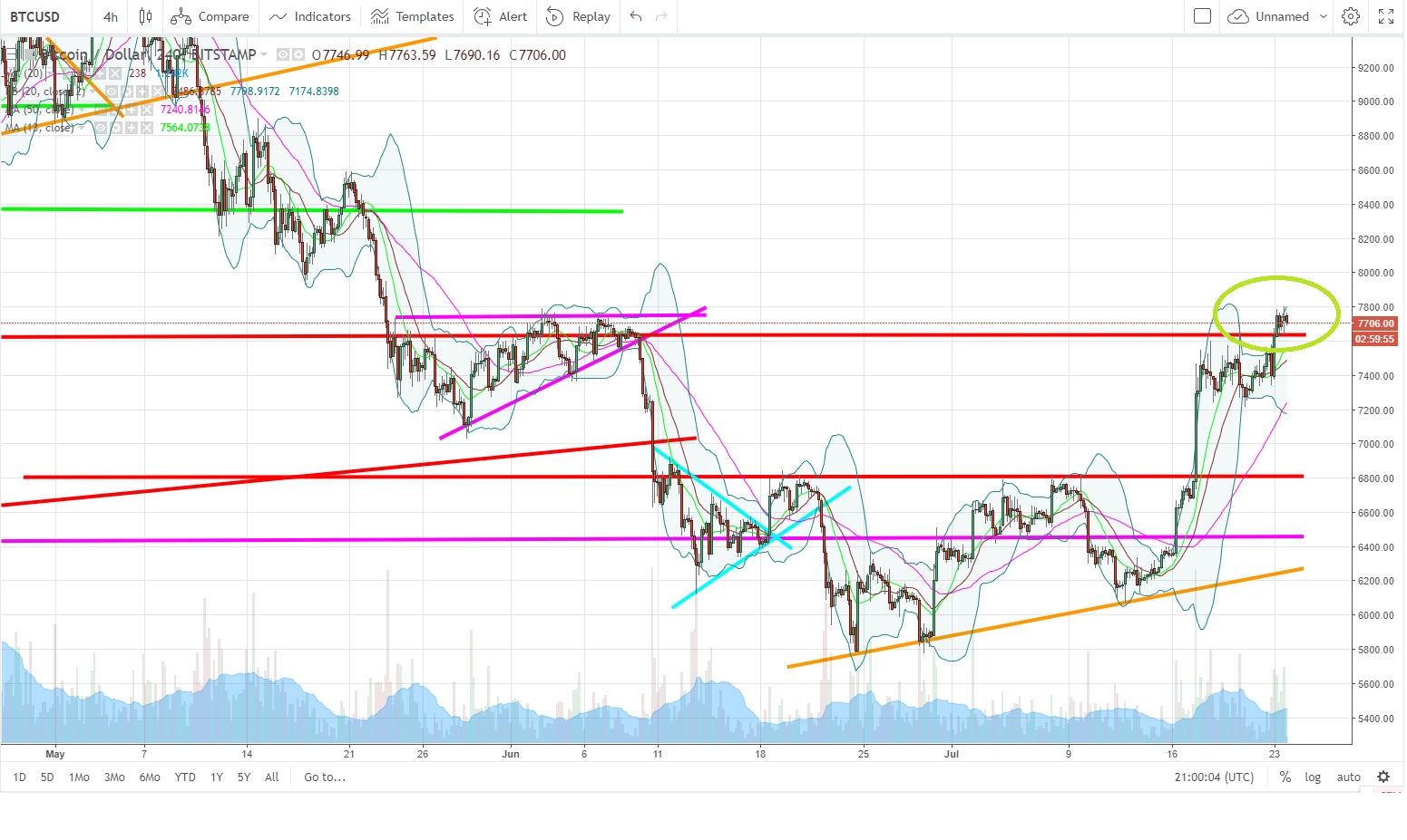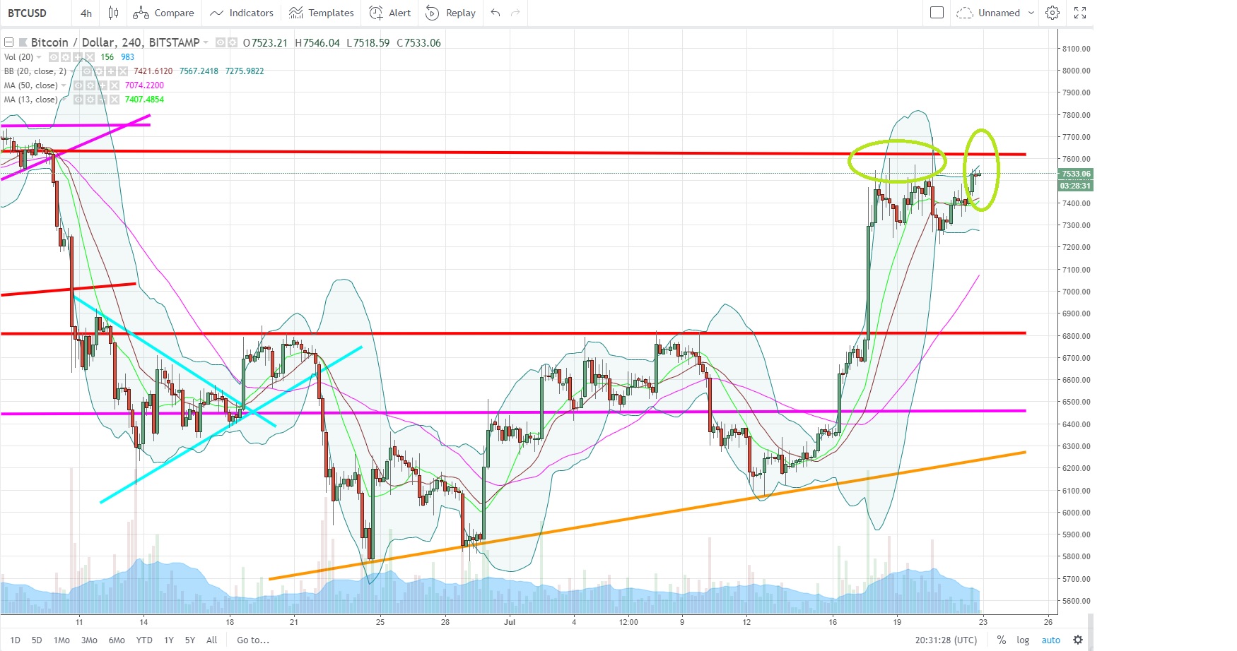 BTC - Resistance line at 7620$ broken