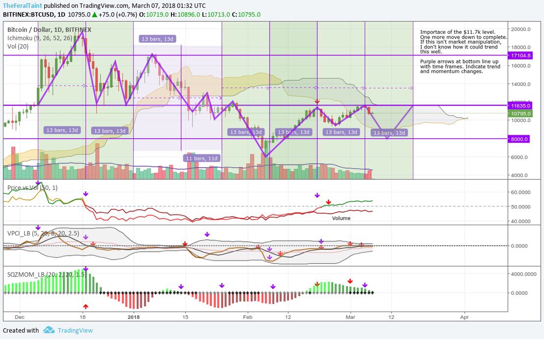 I recently noticed that from $6,000 BTC forward, we had been moving in 13 day cycles up and down. All of these moves matched up with a couple of volume/momentum indicators I use. I started looking back, and I noticed that these Cycles have been going on at least since we broke $11.7k for the first time last year. Below, I've laid out these cycles and their corresponding trend. The obvious next move looking at this chart is to fall to...wait for it.....$8k. Remember how I said my analysis is sometimes "unconventional"? Well yep, but it works sometimes. You can also see how important $11.7 k actually is. All of the constant talk about $10k is pure nonsense. We had trouble moving past it this time because money was just moving from Bitcoin to alt pumps and back. When a little bit of new money finally came in, we broke up with ease. As for this being evidence of potential market manipulation, I am going to be writing a separate article on this later.
