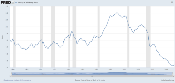 Knowing what we know, the printing press and arbitrary valuation of these currencies must be at an all time high right? Money Velocity must be so high that the Federal Reserve is forced to print this many units in order to keep up with demand and the speed at which these units move. As we see here, this is not the case at all.