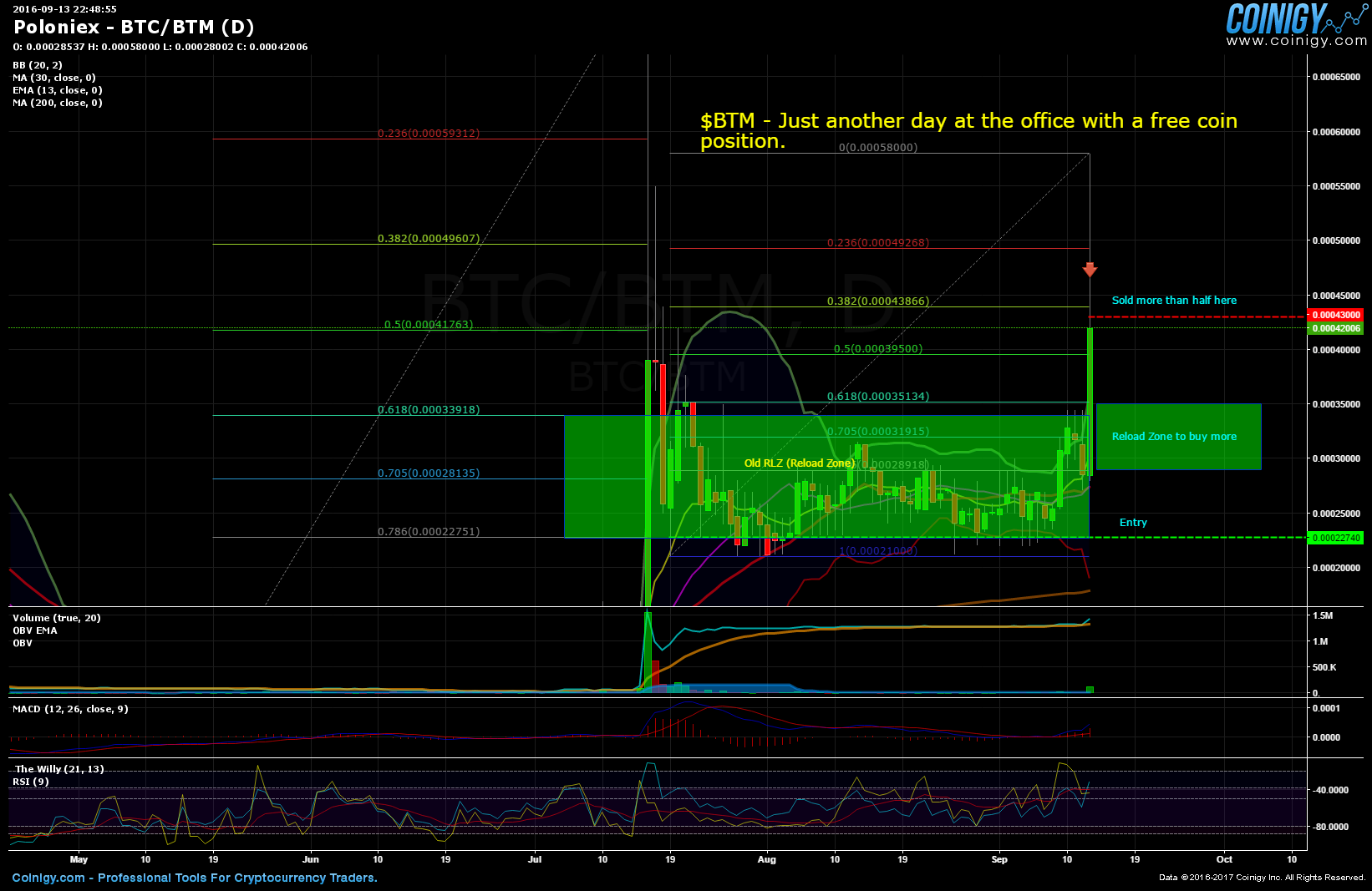 Anyhow I think the move up today was bit of head fake but only time will tell. If I am write I am looking to rebuy in the outlined reload zone (RLZ) that is between the 61.8 level and 78.6 level. I did that last time BTM took off and as you can see it worked out well for me.