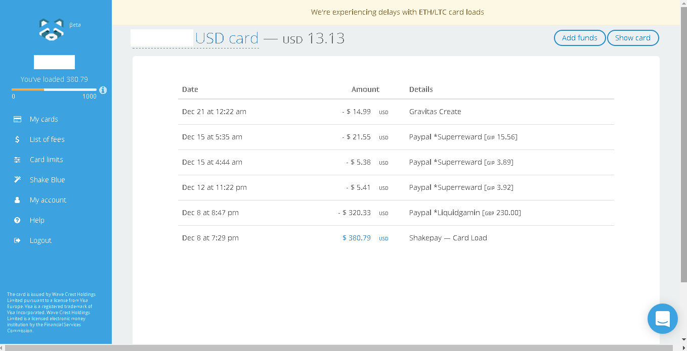 Dec 8 at 7:29 pm $ 380.79 USD Shakepay — Card Load