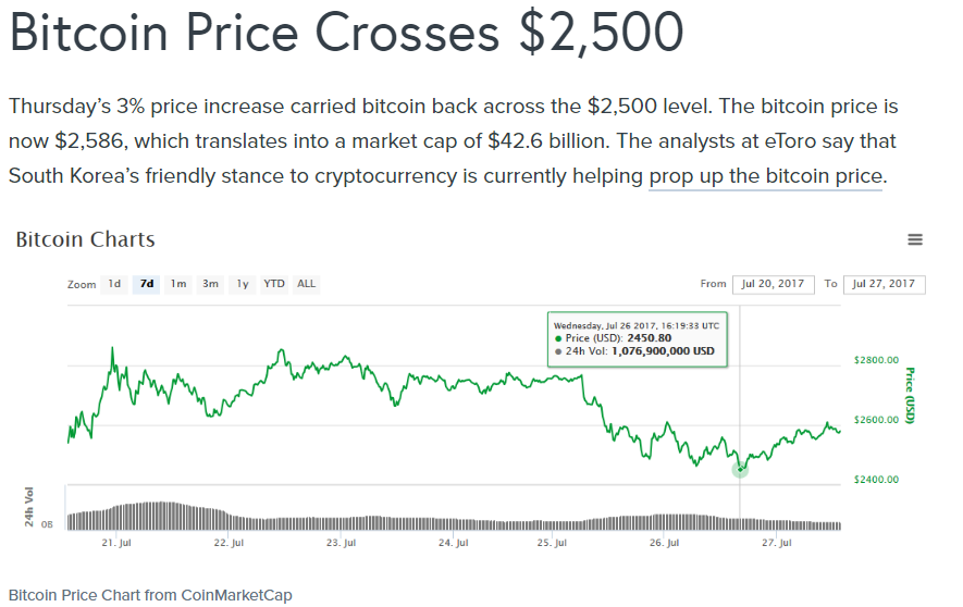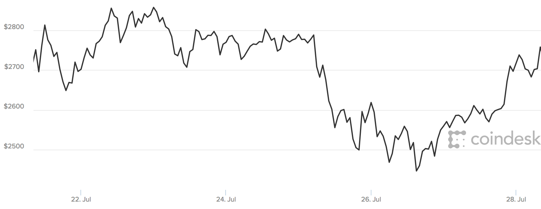 On Wednesday Bitcoin briefly fell as low as $2,433.83, its lowest price since the cryptocurrency dramatically rebounded last week.