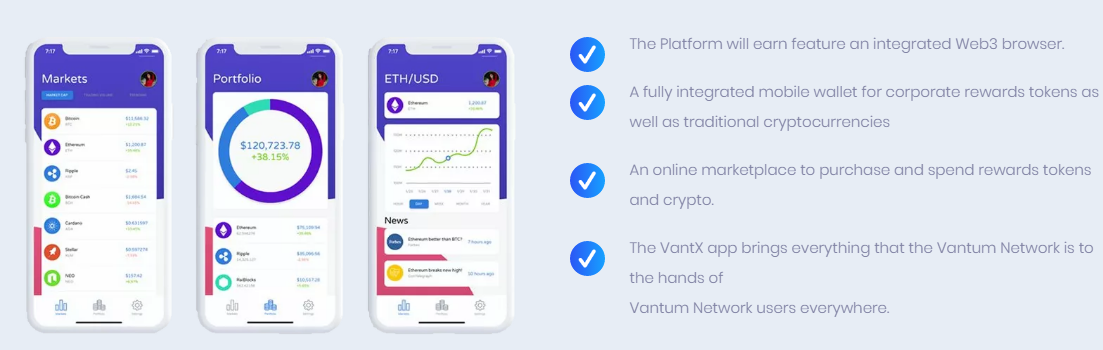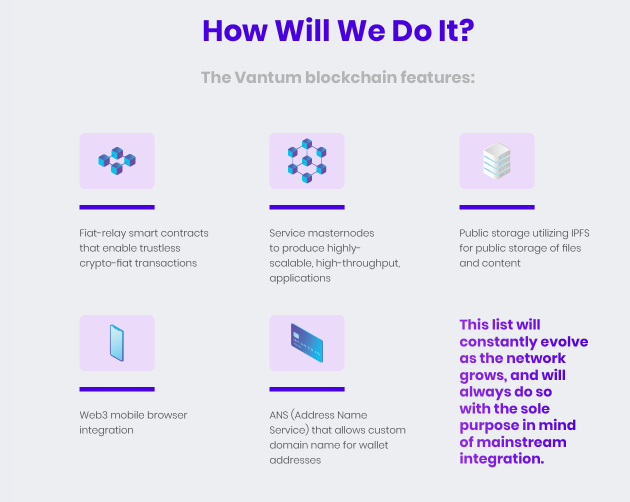 Vantum - это цепочка этических алгоритмов, которая берет все то, что ethereum и оптимизирует функции для обычного внедрения практического и повседневного использования. Цель Vantum состоит не только в том, чтобы создавать лучшие криптоконверсии, но и для создания более полезной блок-цепи, которую разработчики могут использовать для создания приложений, которые устраняют разрыв между транзакциями в реальном времени и более быстрыми, более безопасными криптовыми валютами.