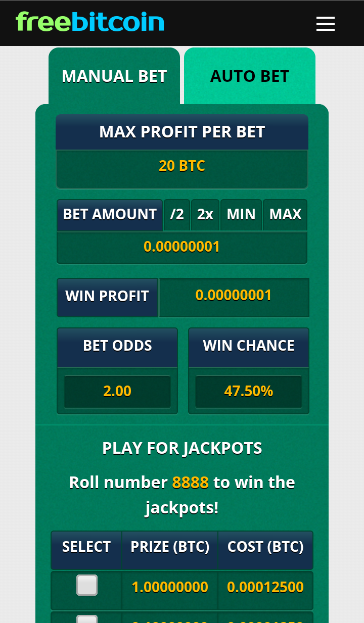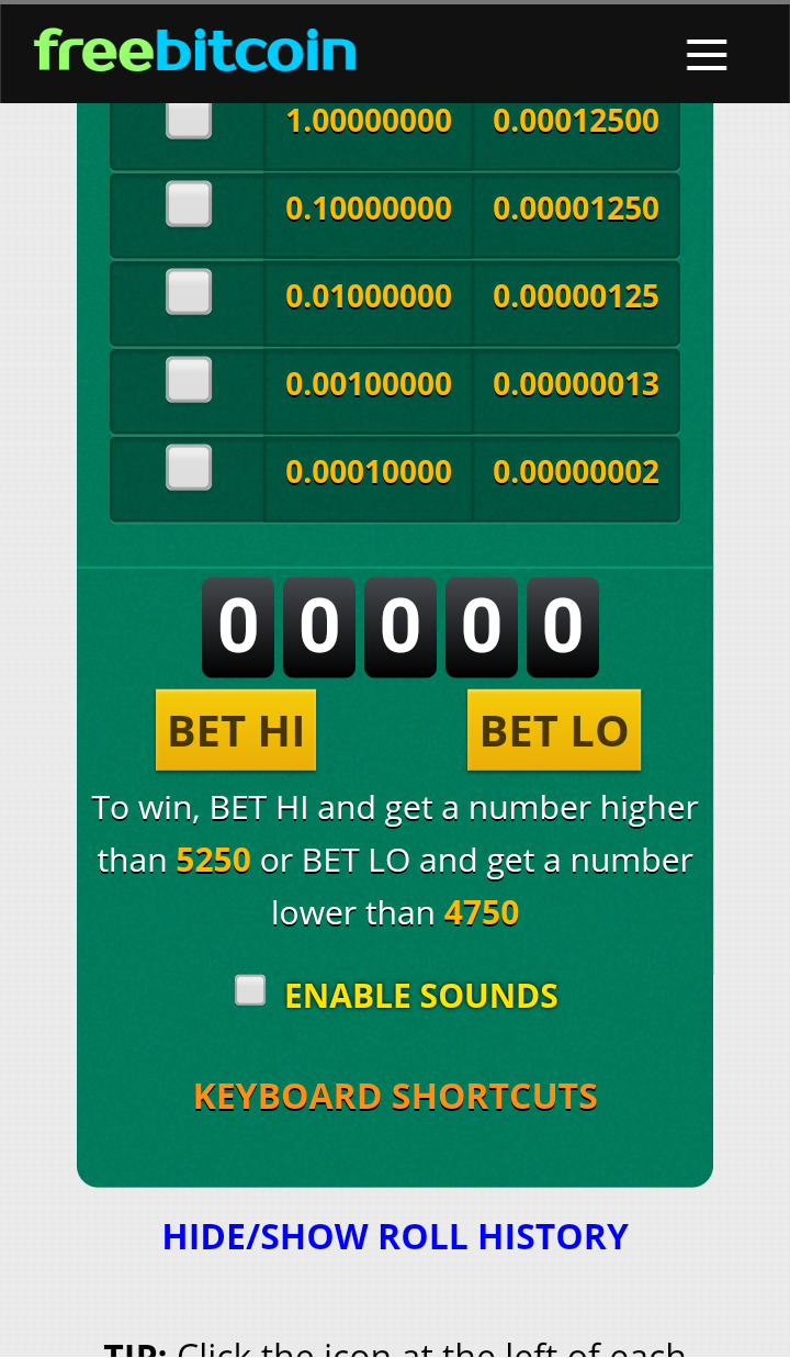 There you can enter the amount you want to play and click on the HI or LOW bottom . you can see if you bet LOW and get the number less than 4750 your BTC will be doubled and if you bet HI and get the number higher than 5250 you will double your BTC but if you bet high and get low number than you will loss your earned BTC.
