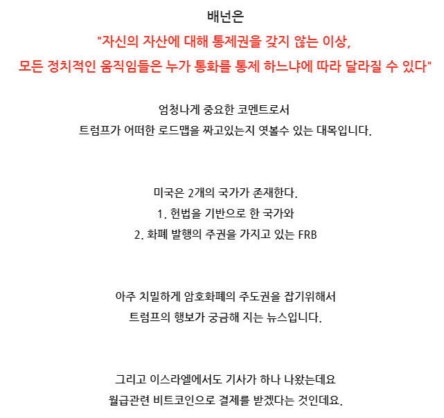 크게 트럼프와 미금융 모두 암화폐관련 수용은 확실해 졌고, 이제 주도권을 누가 잡느냐가 관건 입니다.