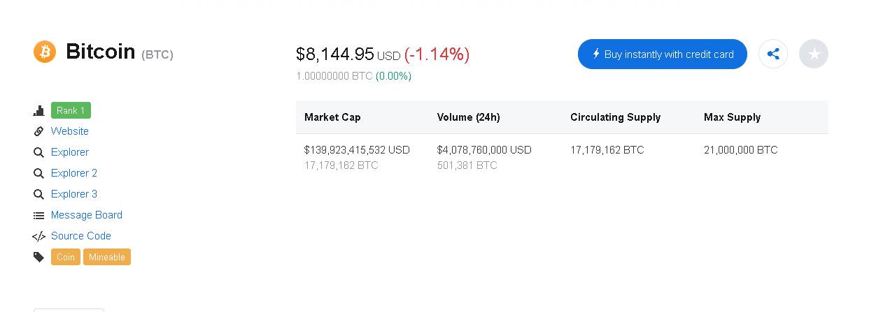 I had a feeling that the price of bitcoin was going to be down a bit today, but lucky it's not down by too much. The good thing is that it's still above $8,000 so I'm fine with that. Right now it's at $8,144 and has gone down by 1.14% in the last 24 hours. I will have to keep checking the price and maybe it will be in the green tomorrow.