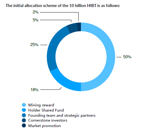 Early release part: in order to ensure market stability, 5% of HIBT will be gradually put to the cornerstone investors after 6 months on the platform, and HIBT that don’t put into market will be locked out as non-tradable currency on the platform and not participating in the dividend; 2% is used for marketing, HIBT that don’t give to the participants of the promotion actives, and is also locked as a non-tradable currency on the platform, not participate in dividends.