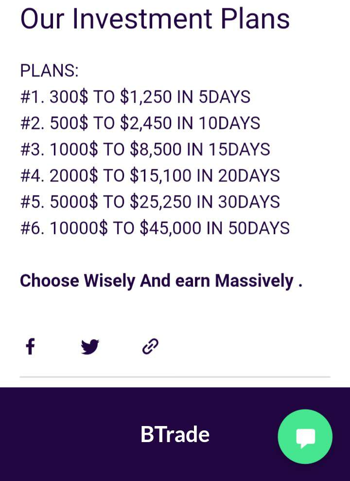 We give the best plans to earning in days, an investment platform that I have gain so much from and still making high profit in days, weeks, and months.