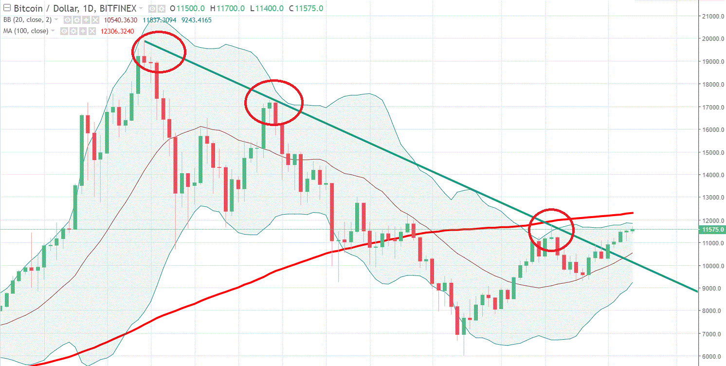 The $BTC downtrend started on December 17th 2017, just after a meteoric rise to $20,000. Since then, we've seen consistent downward price action, with lower lows and lower highs being set. This downward trend is illustrated by the green trend line in the image above.