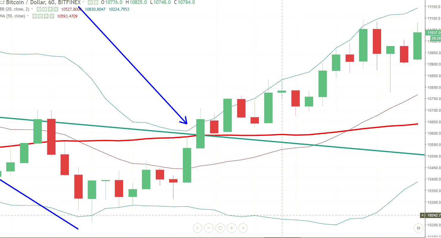 Firstly, from the above image, we can see that this time, $BTC rode the middle of the Bollinger (the 20-day moving average) into the resistance line. This meant that it was not challenged by the resistance it had previously met at the top of the Bollinger, and was supported underneath by the middle Bollinger instead.
