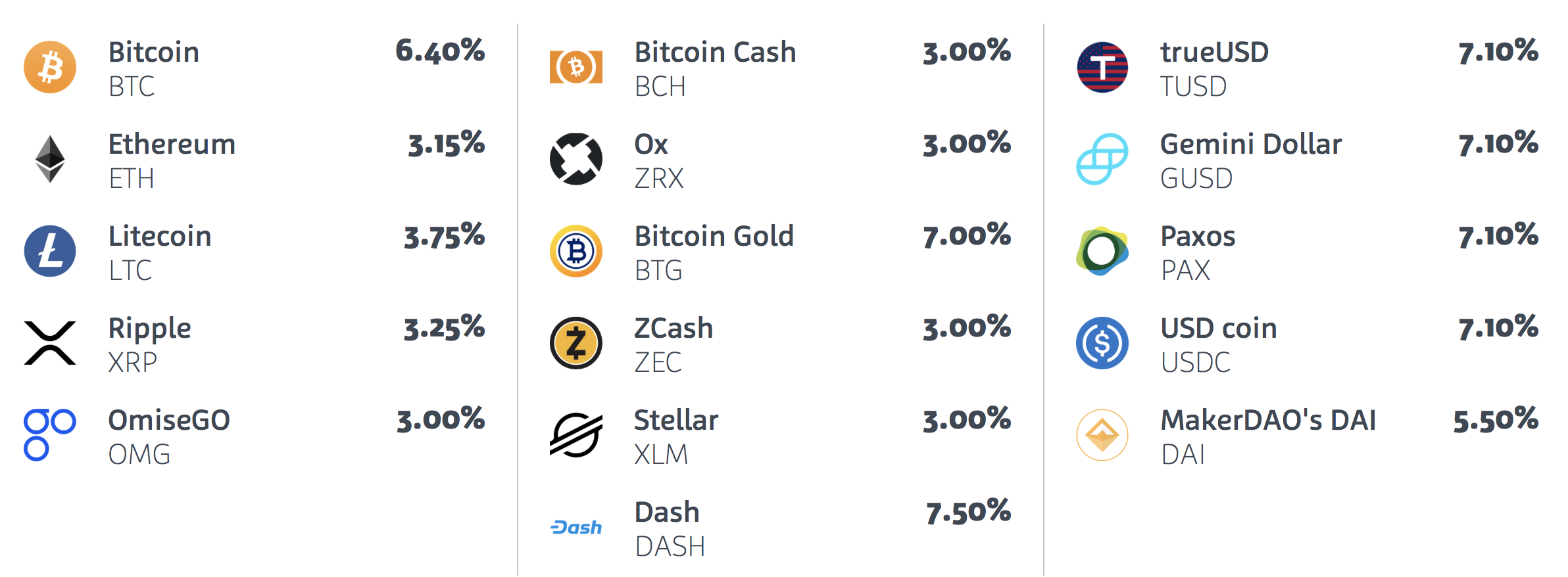 The interesting thing here is that your wallet with this platform earns your cryptocurrency annual interest of upto 7.10%. You can find the list below.