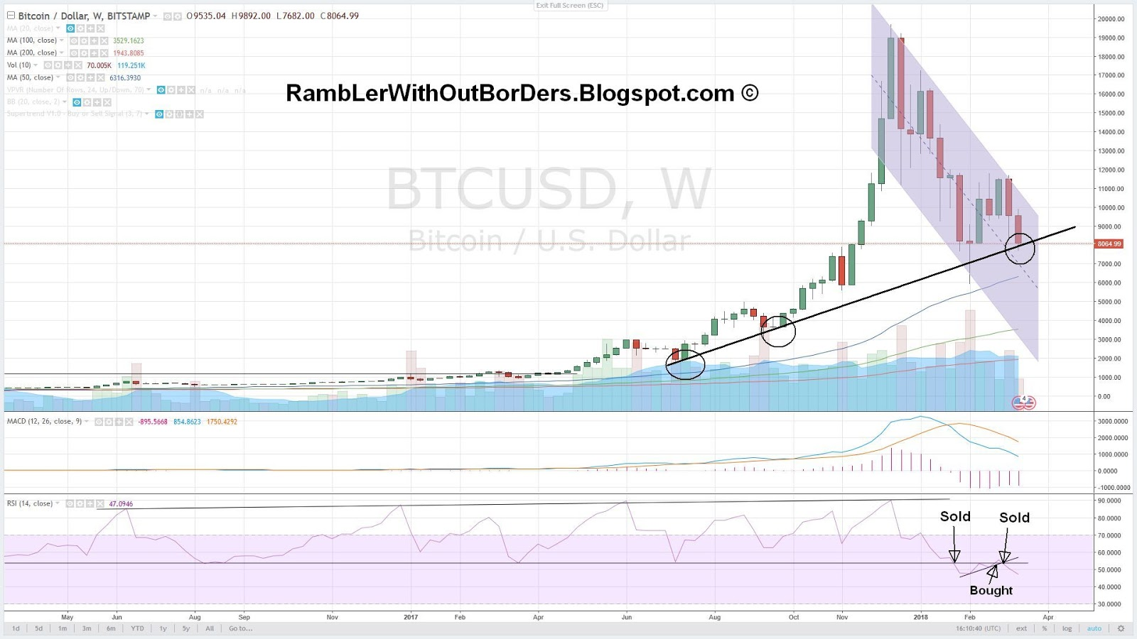 Now that the weekly RSI has broken below the horizontal line that had held since Oct 2015, it suggests to me pretty negative technical sentiment. This gives me the feeling that the Bitcoin price probably wouldn't hold this support at "D". Also we've something developing right now that looks like a head & shoulders formation.