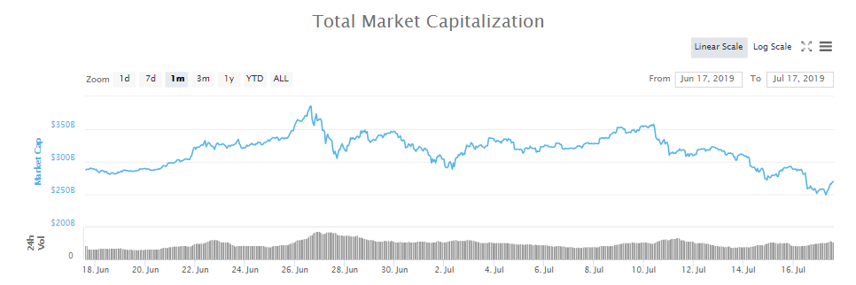 The chart below shows the total crypto market capitalization. As you can see we peaked in late June around $385 billion. It recently hit a low of $250 billion.