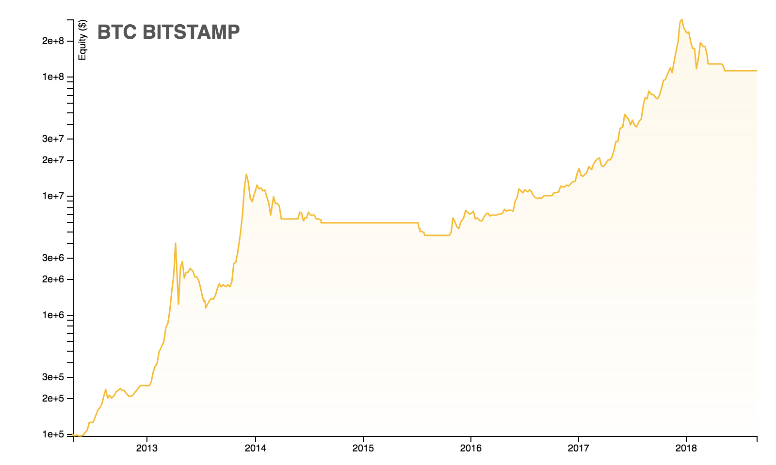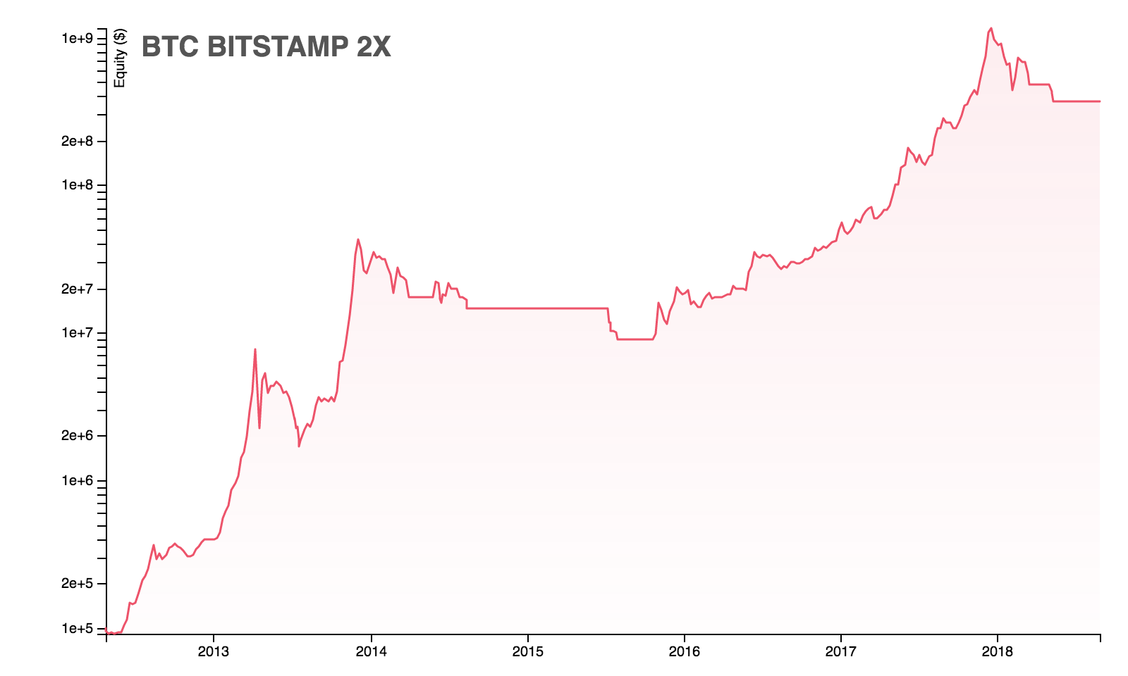 It performs almost like "buy and hold", which gives us (in today's prices): $6700 / $5 = 1340x. But here is the trick: why not to add a reasonable level of leverage? Even with modest 2:1 we get this: