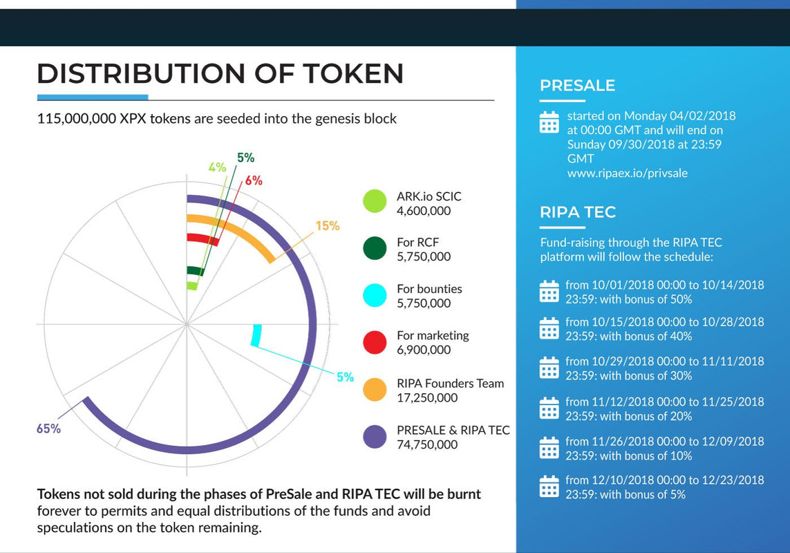 Each blockchain platform is supported via tokens which are a measure of cost or operation on the network. The token image used by ripaex is XPX. This is increasing finance to actualize the road map of the business. Currently has ICO token income. This XPX token can be purchased with one of the BTC, ETH, ARK, LISK cryptocurrency at the cost of one XPX token that might really be worth zero.10 kilo. Their PRESALET: which will take place from April to June 2018 RIPA TEC: with the aim to run from July to December 2018.