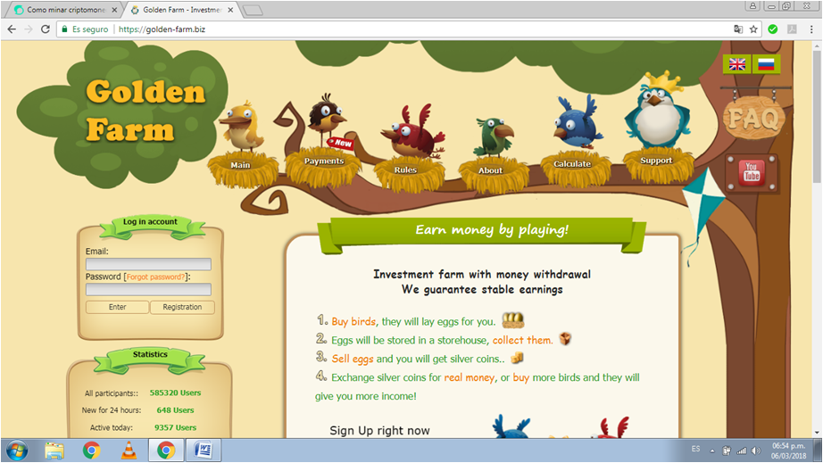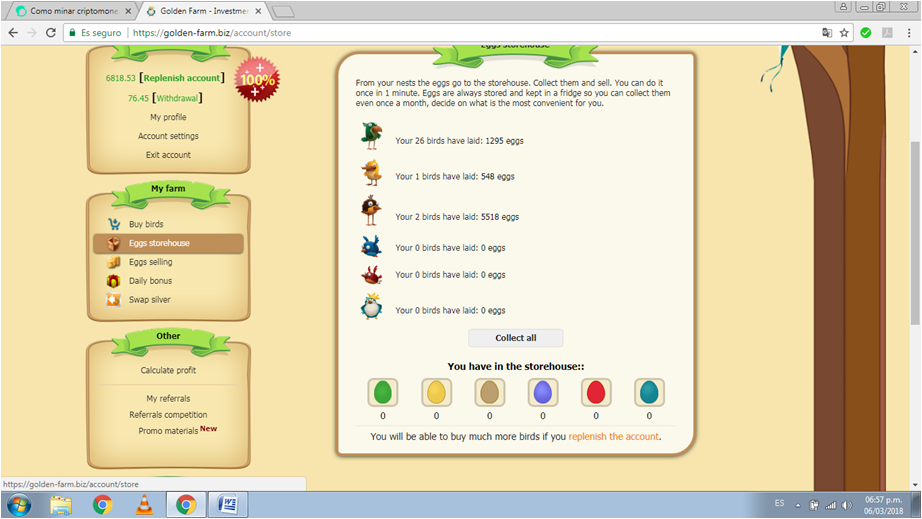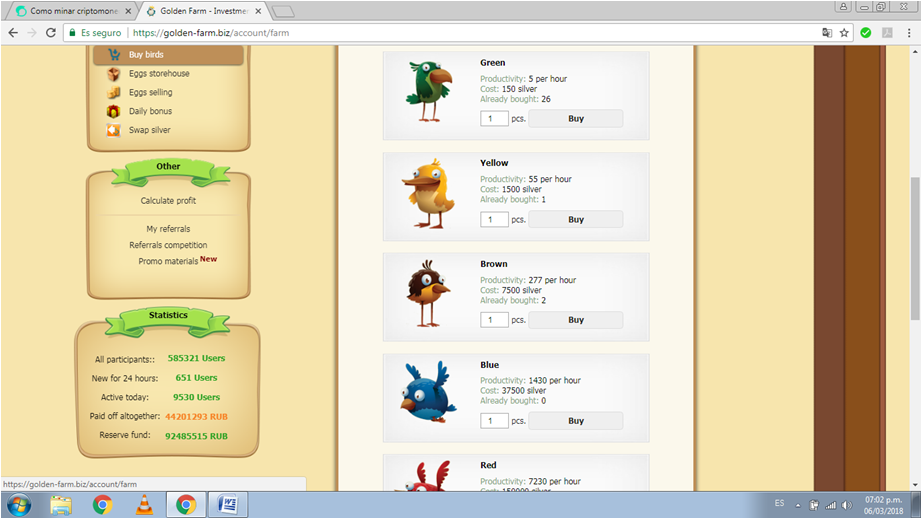 La plataforma es un simple juego que consiste en tener aves que ponen huevos, que luego se pueden vender por silver coins, en un principio tendrás un ave verde y 300 silver coins...