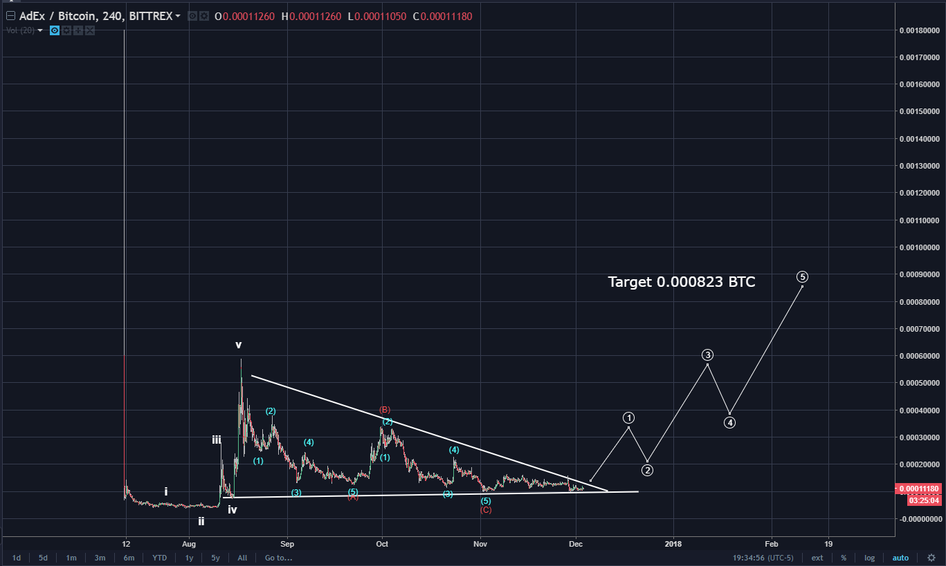 The ADX/BTC pair's symmetrical triangle shows price almost at the terminal end of the apex point. The Apex is the point at which the two lines of the triangle intersect. The closer price gets to the Apex, the more the pent up need for price to escape the encompassment of the triangle. A breakout on this pair is imminent!