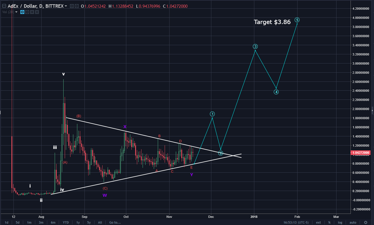 AdEx (ADX/USD) pair is completing, if not yet complete, a correction that clearly was very long and extended as shown in below chart. After an impulse set of white waves i,ii,iii,iv,v which took place very quickly, the correction followed and it was a complex form of the WXY type as shown. I believe if this correction is complete, then a powerful impulse wave will breach out and above the triangle shortly. Laddering in now would be highly recommended given a target of $3.86 or a 267% profit potential!