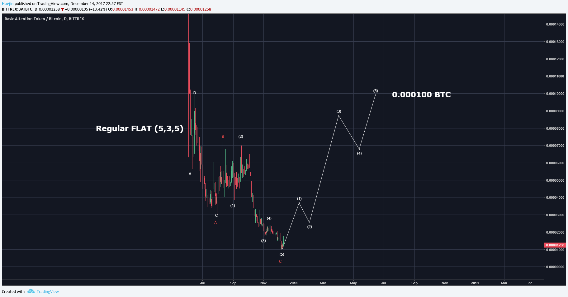 Here is the BAT/BTC pair. There was a 3,3,5 FLAT correction of a,b,c waves. I count the five subwaves of the red c wave. There might be one more lower low, but not required. The white impulse is showing bullish target of 0.000100 BTC!