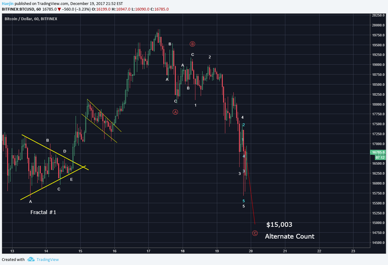 There is a scenario for one more lower low as shown below and if so, we could see $15,003 but this is not required. Let's see what happens overnight.