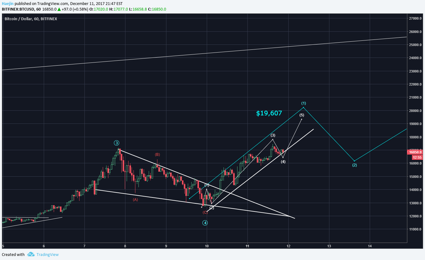 I've added the channel lines for the impulse wave to blue (1). If the waves fit well within a channel, it's confirmation that there is an impulse in progress. This chart shows white wave (5) at $19,607. One consideration I'm giving is that once Bitcoin hits blue wave (1) and corrects to blue wave (2), the Altcoins might not and instead rise. This would be the situation if bitcoin to altcoins become non-phasic. What I mean by this is that when BTC corrects its cycle will be declining; however, if the cycle of the Altcoins are not decline but rather inclining. Let;s see what happens,