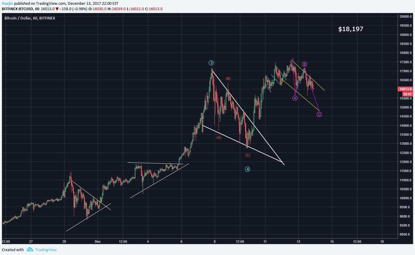 Here is my Third count, and the small Head & Shoulders could put a little pause to the uptrend. If so, price has minimum price move potential for $14,161 or so. However, this is the least probable for me, but for awareness sake, these pathways coudl keep the panic away!
