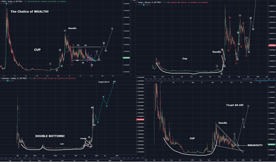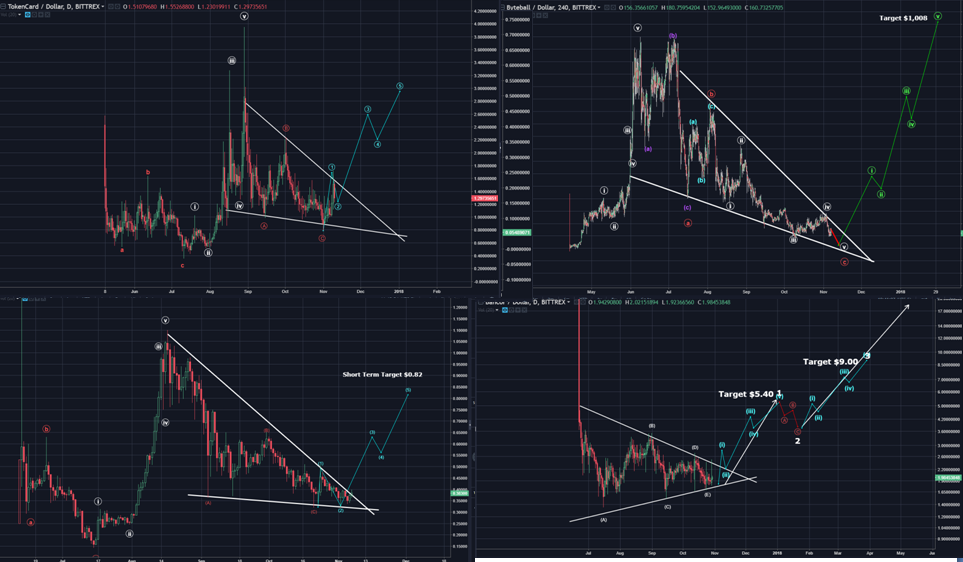 Again, the Bullish Speciation of Altcoins in the three primary Chart/Elliott Wave patterns as shown below, is expected to support higher highs. Bitcoin crashing with such Altcoin Bullish stage is unlikely.