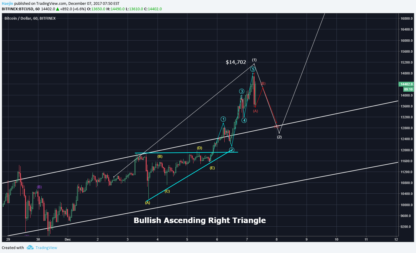 I think this thing is moving much more quickly than expected.....I think we are close to being done with 2...but different markets have increasingly different price reports. Kraken shows a high of 15200 and is about to break that number as well....while Bitfinex as you show hit 14702, and Bittrex shows 14798. Bitfinex and Bittrex not too different, but that's a $500 difference with Kraken. Perhaps it is an expanded flat, but I think we may be headed up again already....that would be quite fast if so. Just my two cents.
