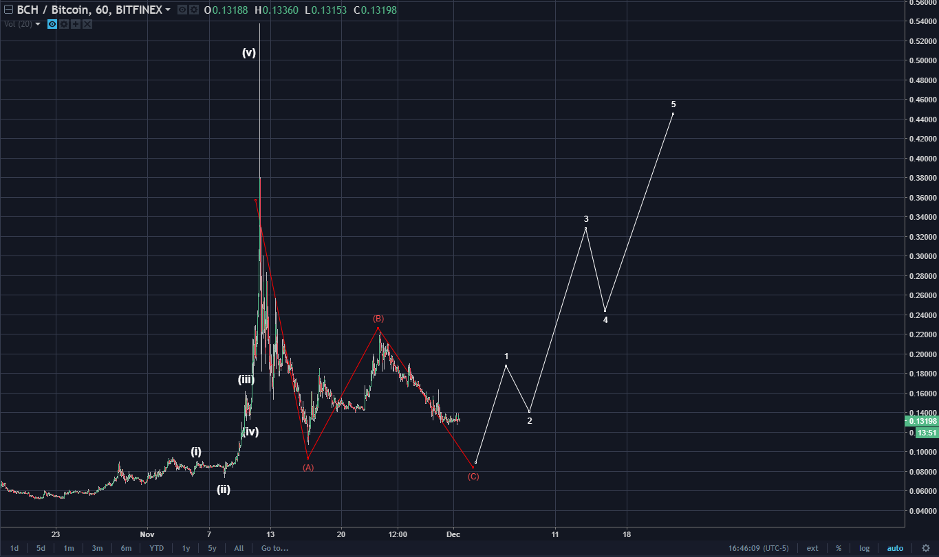 The BCH/BTC pair is a laggard. The abc correction could take this direction. So, one more lower low would be called for prior to an impulse.